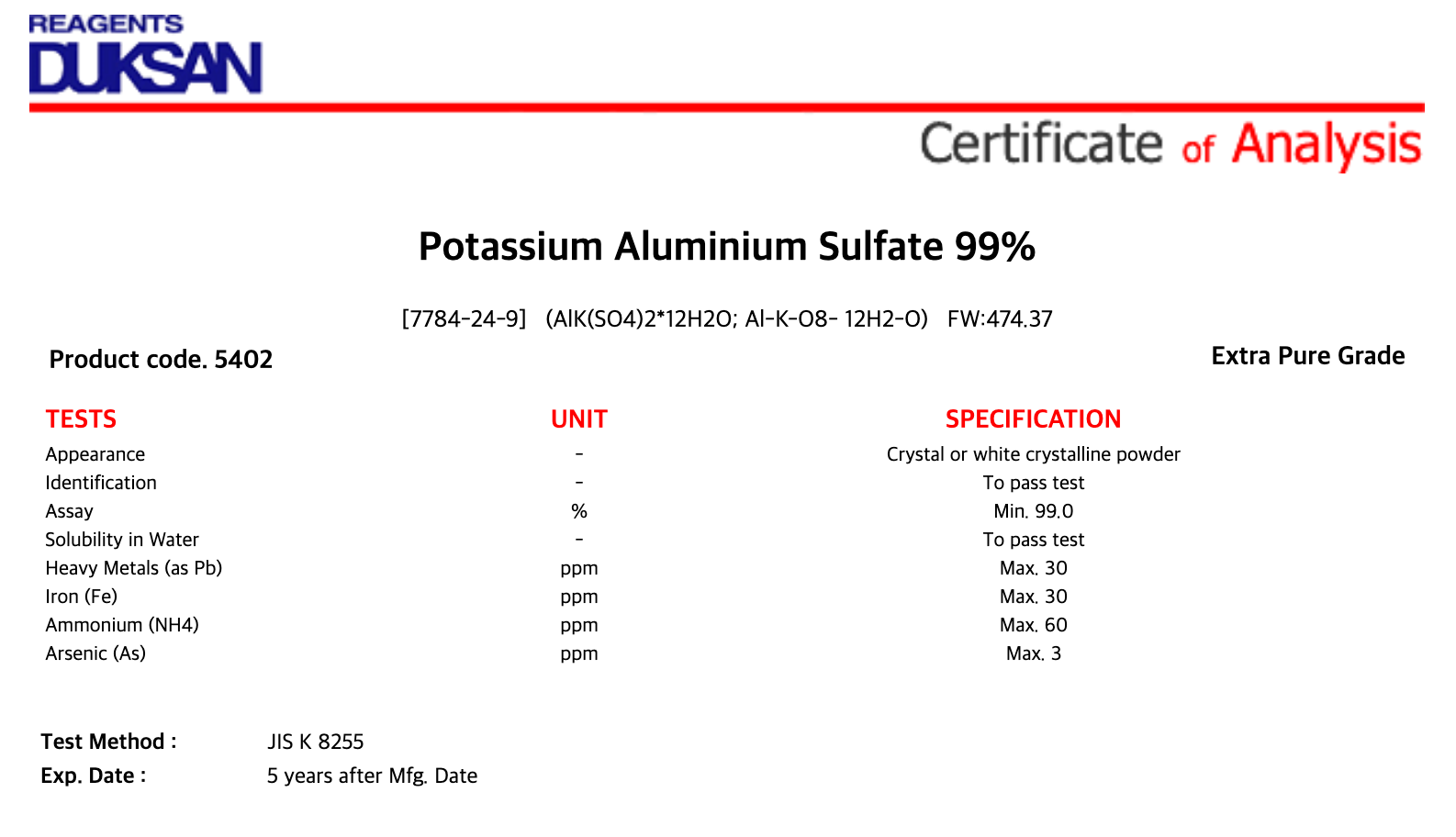 [5402] Potassium Aluminium Sulfate, Extra Pure, 1 kg, CAS# 7784-24-9 + 14,400원