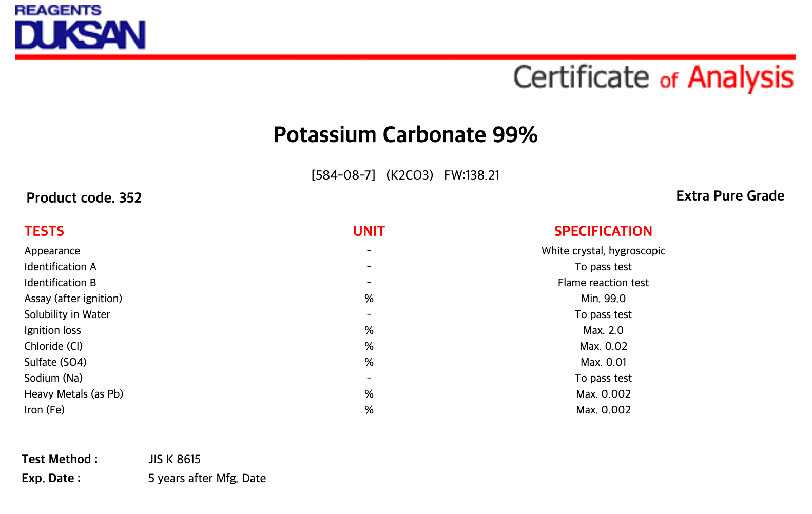 352 1. Potassium Carbonate, Extra Pure, 25 kg, CAS# 584-08-7 1/EA 소비자가 : 154,000원