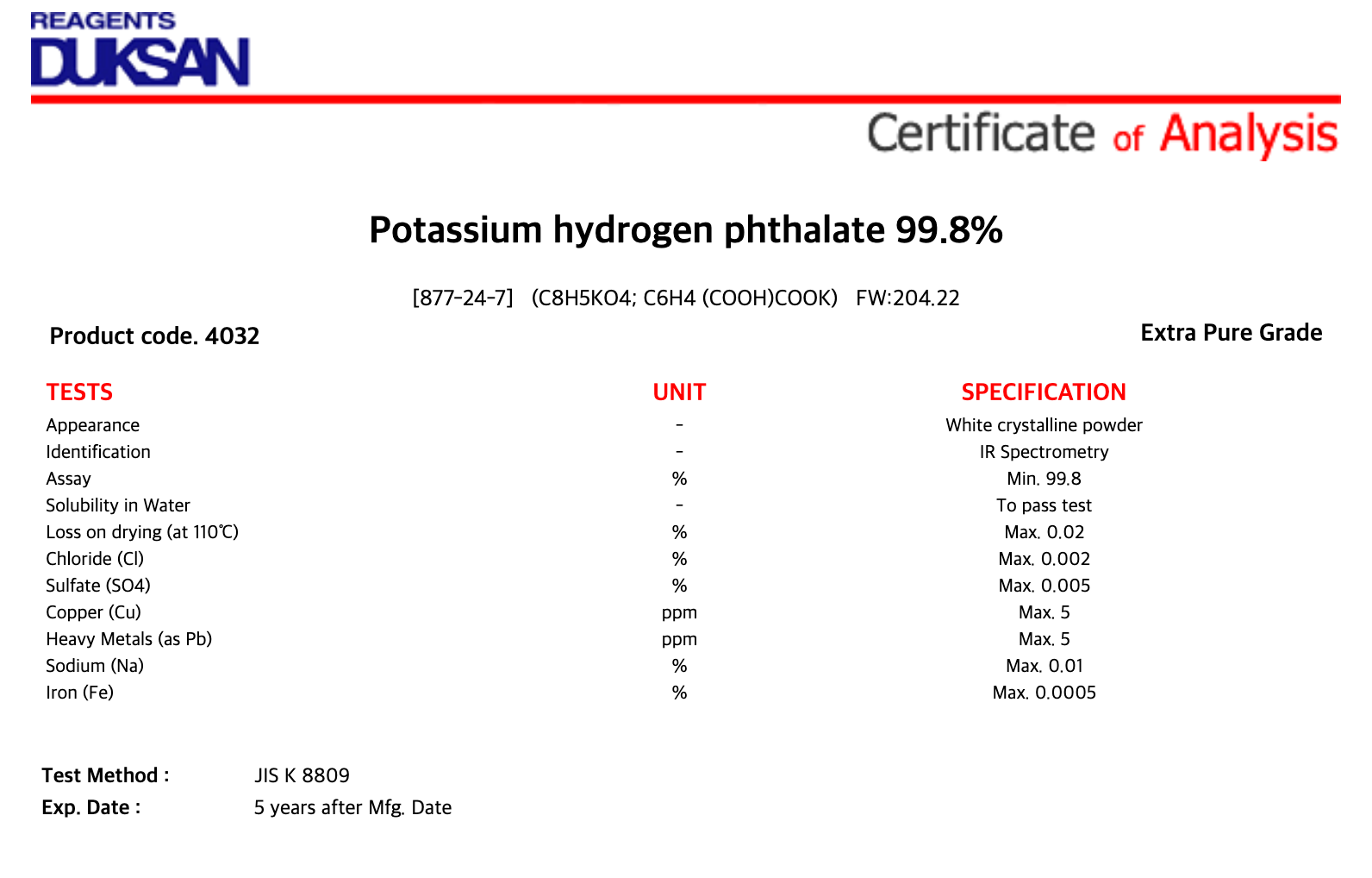 [4032] Potassium hydrogen phthalate, Extra Pure, 1 kg, CAS# 877-24-7 + 33,300원