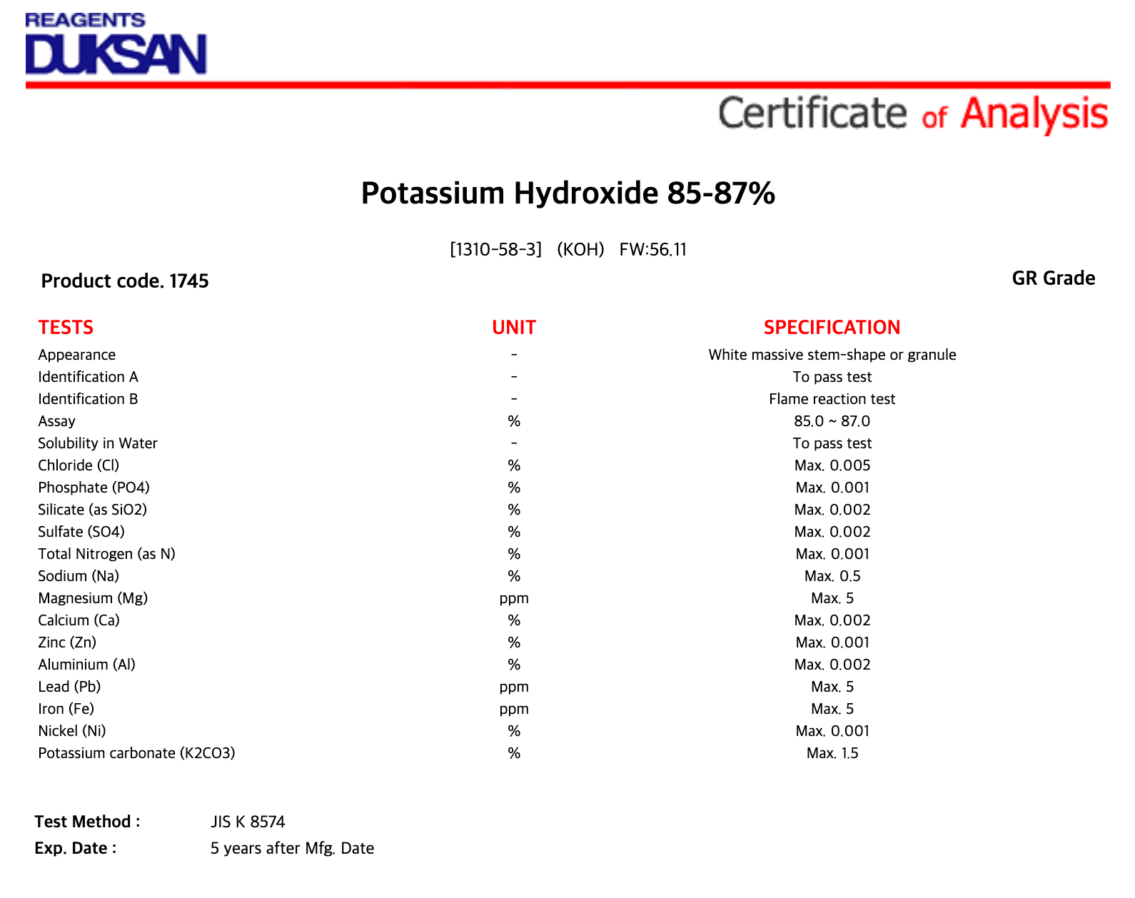 Caustic potash; Potassium hydrate; Potassium hydroxide, dry solid, flake, bead or granule; Potassium lye