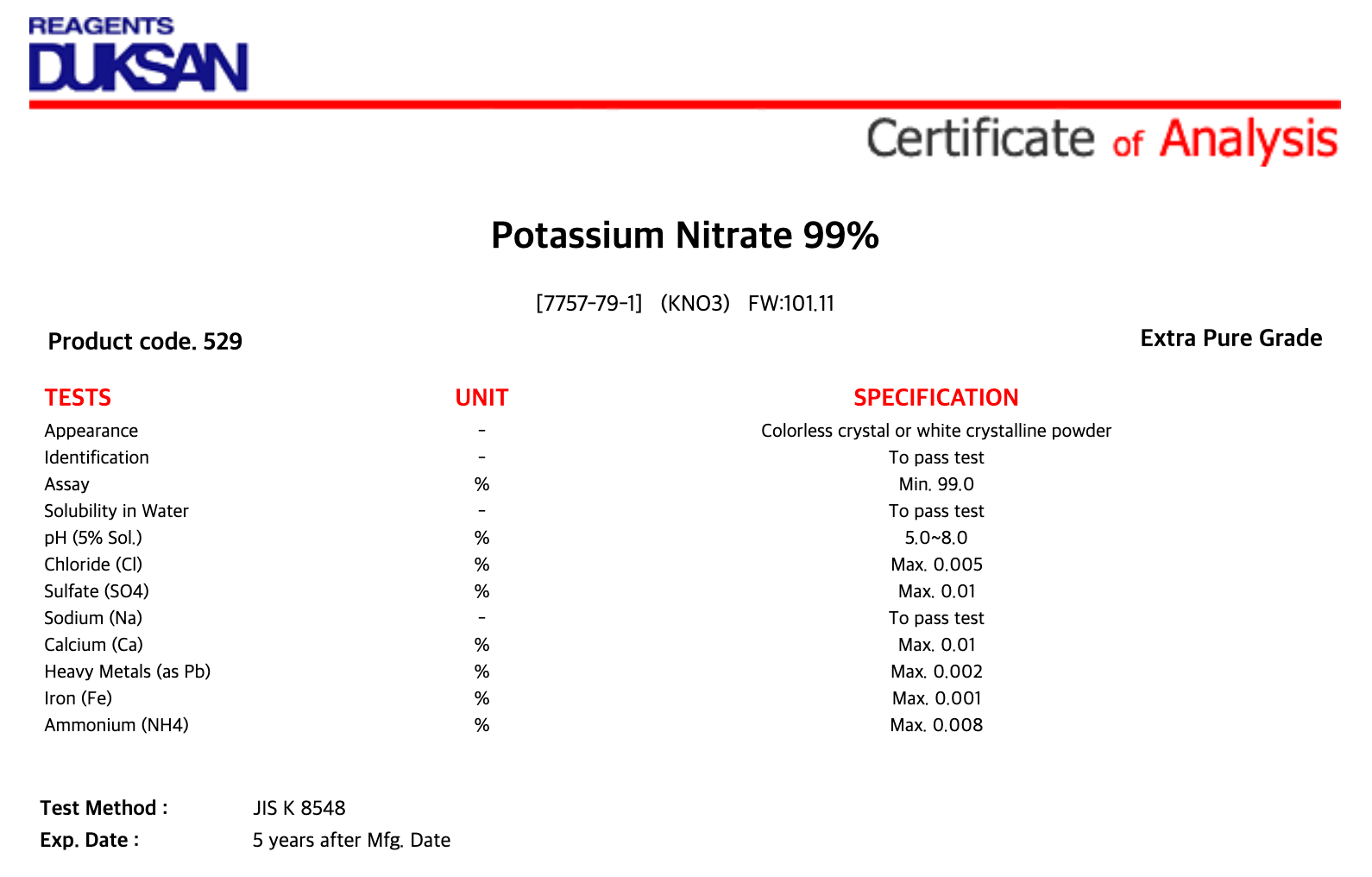 질산 칼륨 염(NITRIC ACID POTASSIUM SALT);질산 칼륨 염 (1:1)(NITRIC ACID POTASSIUM SALT (1:1)); 콜로-보(COLLO-BO);니테르(NITER); 니트레(NITRE); 초석(SALTPETER)