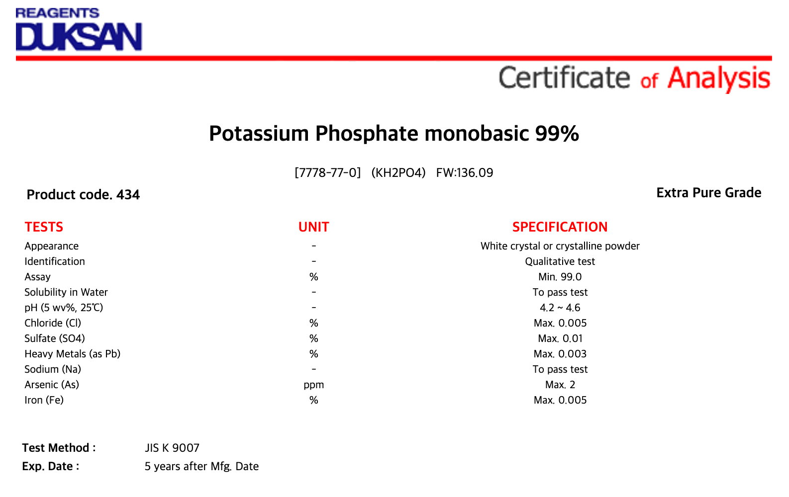 434 1. Potassium Phosphate monobasic, Extra Pure, 25 kg, CAS# 7778-77-0 1/EA 소비자가 : 266,500원