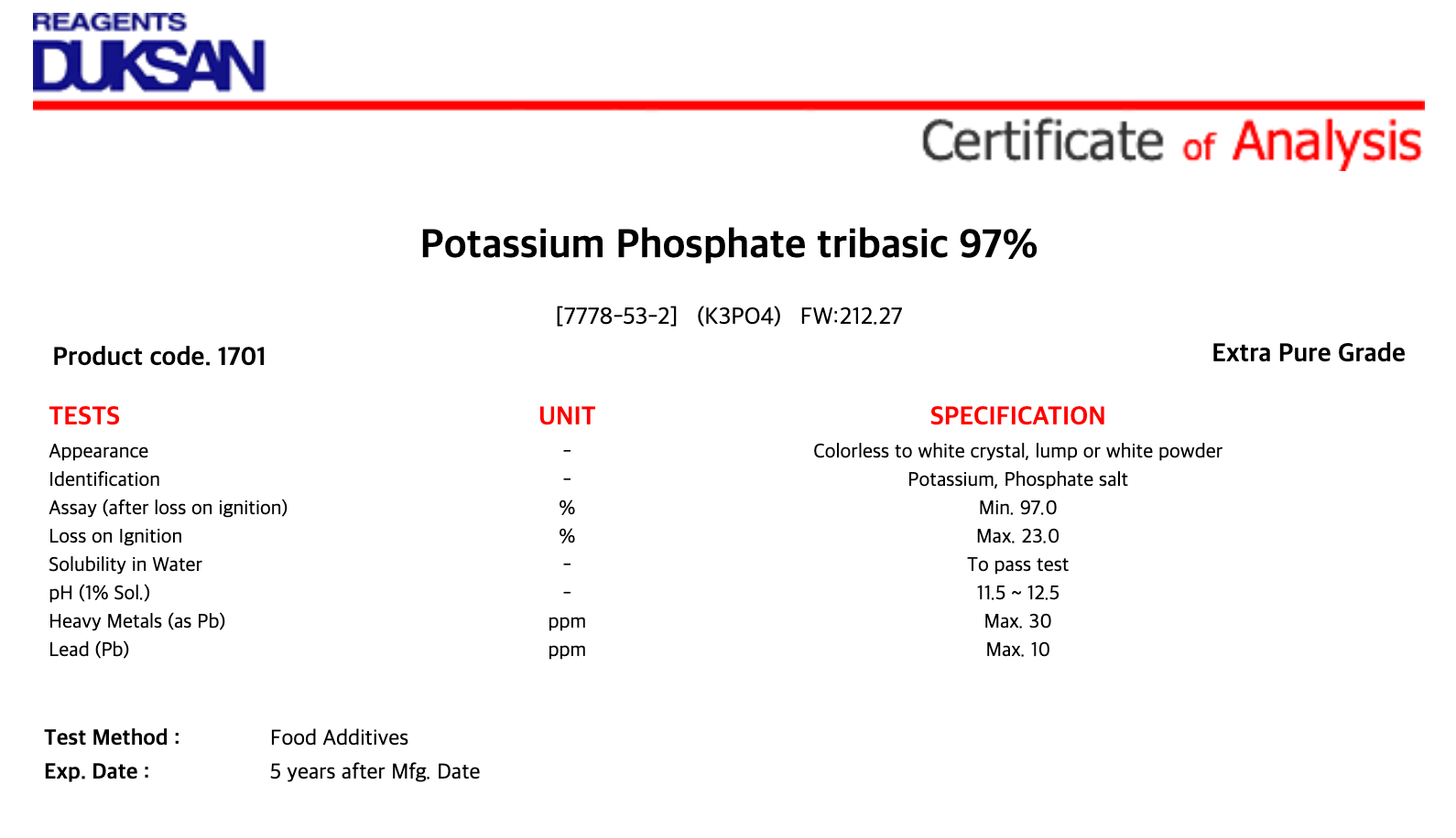 1701 1. Potassium Phosphate tribasic, Extra Pure, 500 g, CAS# 7778-53-2 1/EA 소비자가 : 12,700원