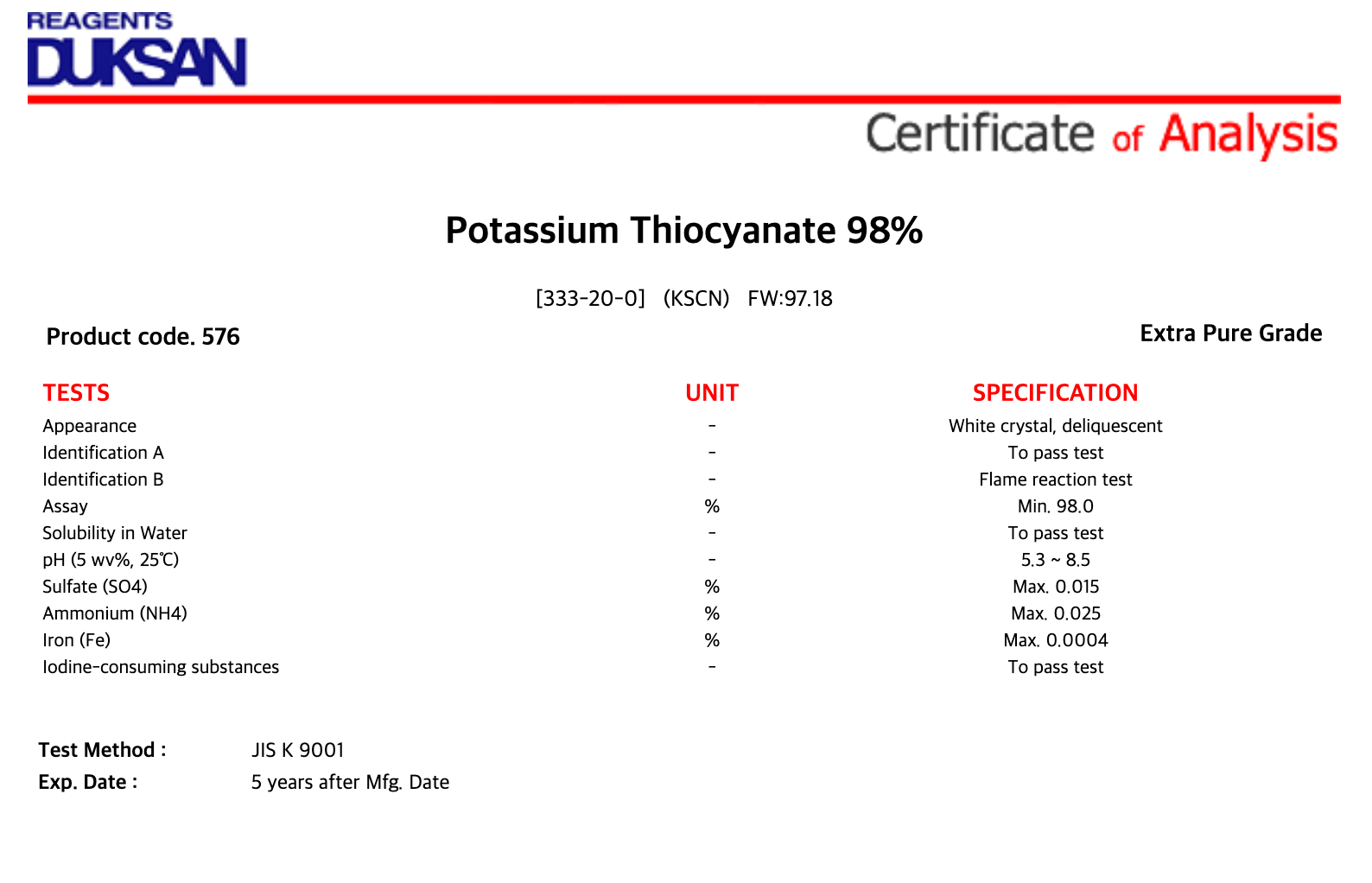 [576] Potassium Thiocyanate, Extra Pure, 500 g, CAS# 333-20-0 + 20,600원