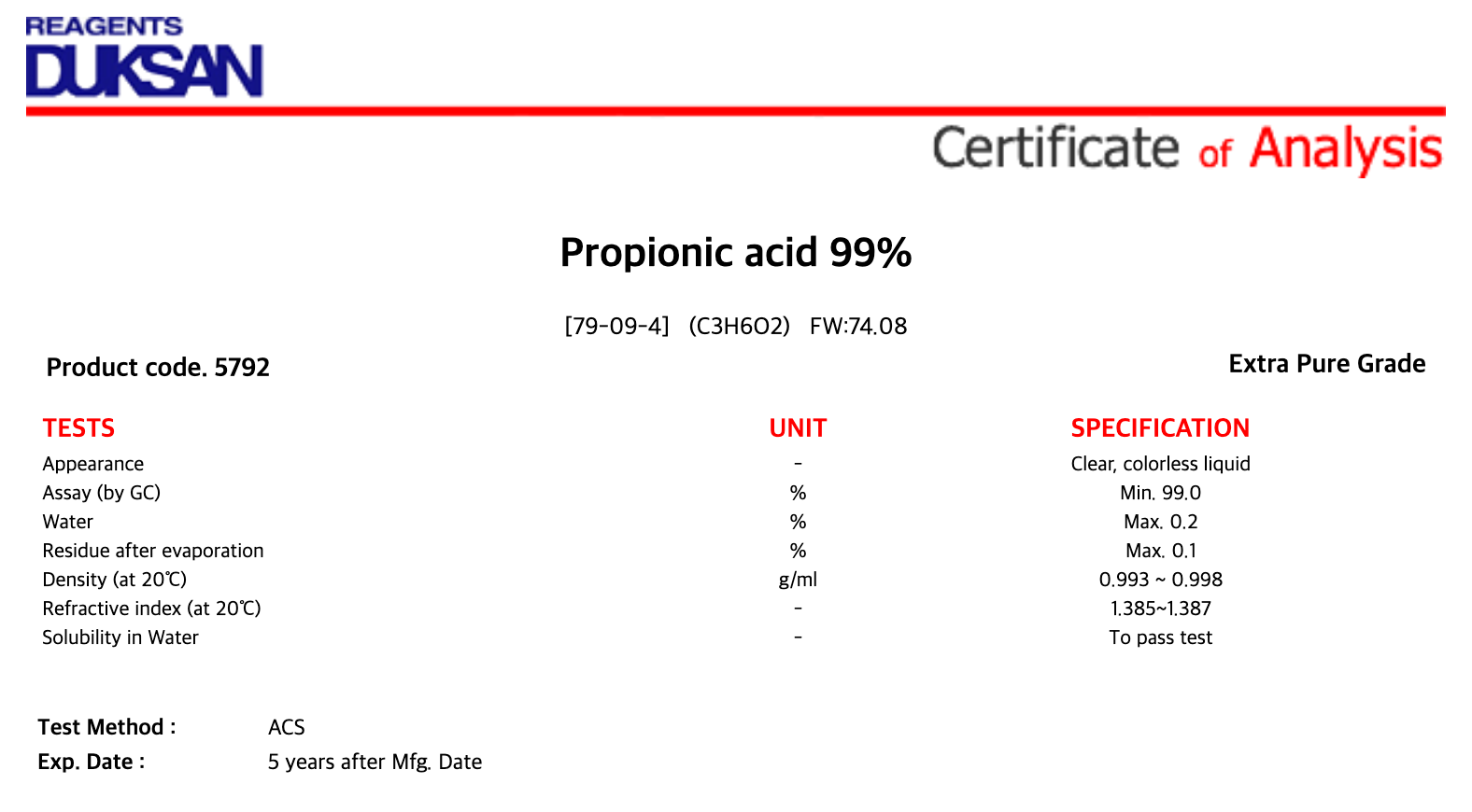 Carboxyethane ; Ethanecarboxylic acid ; Ethylformic acid ; Metacetonic acid ; Methylacetic acid ; Pseudoacetic acid