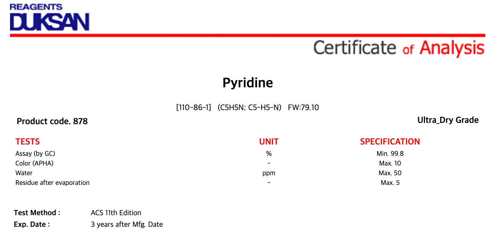 [878] Pyridine, Ultra_Dry, 4 ℓ, CAS# 110-86-1 + 261,200원