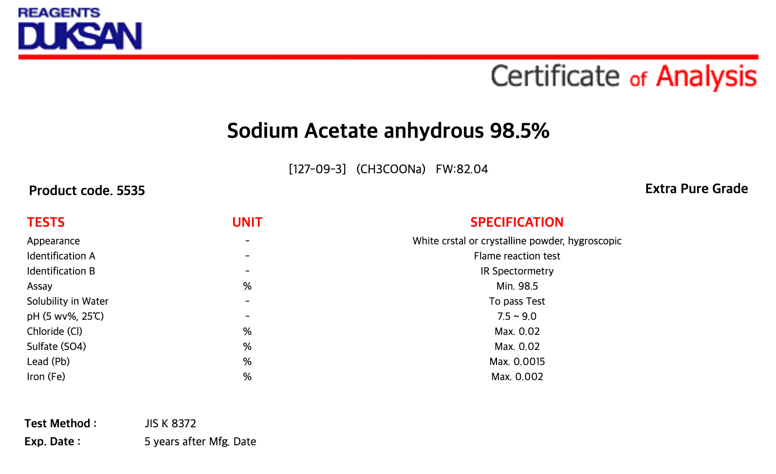 [5535] Sodium Acetate anhydrous, Extra Pure, 1 kg, CAS# 127-09-3 + 13,700원