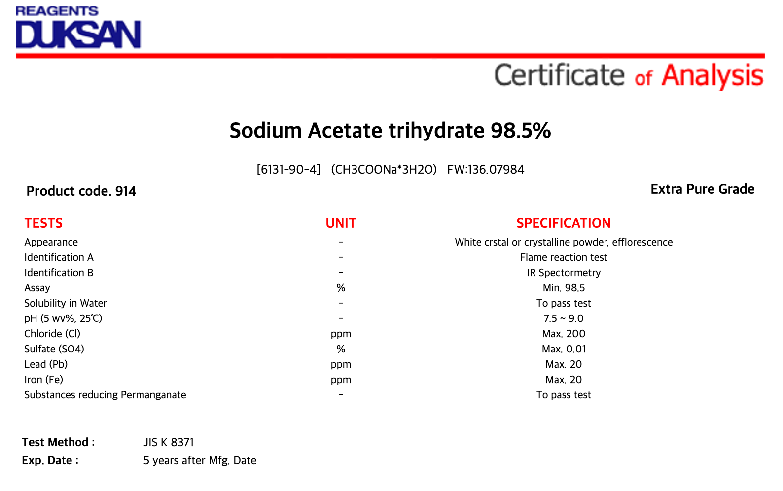 [914] Sodium Acetate trihydrate, Extra Pure, 500 g, CAS# 6131-90-4 + 6,600원