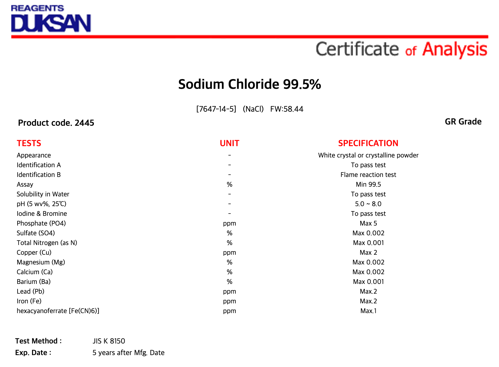 2445 1. Sodium Chloride, GR, 1 kg, CAS# 7647-14-5 1/EA 소비자가 : 9,400원