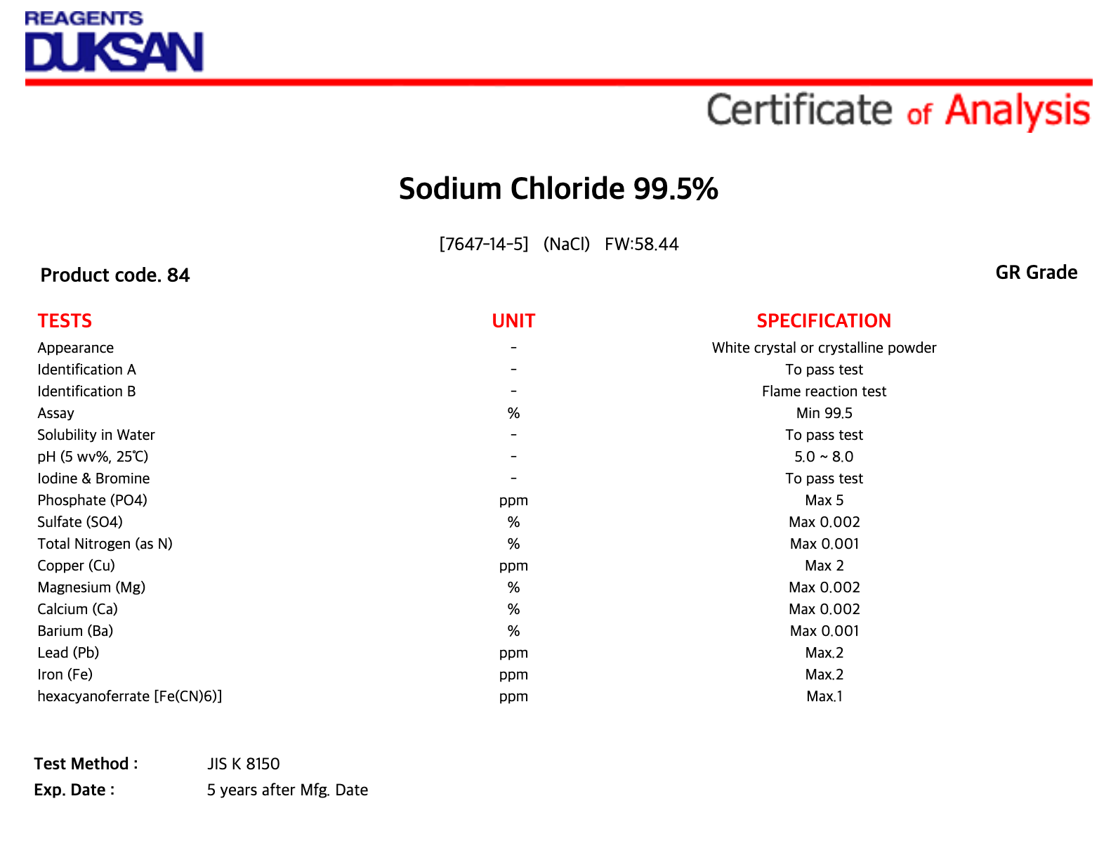 84 1. Sodium Chloride, GR, 500 g, CAS# 7647-14-5 1/EA 소비자가 : 5,800원