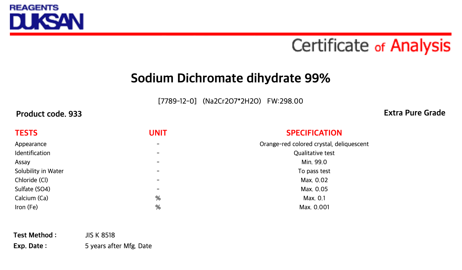 933 1. Sodium Dichromate dihydrate, Extra Pure, 1 kg, CAS# 7789-12-0 1/EA 소비자가 : 15,800원