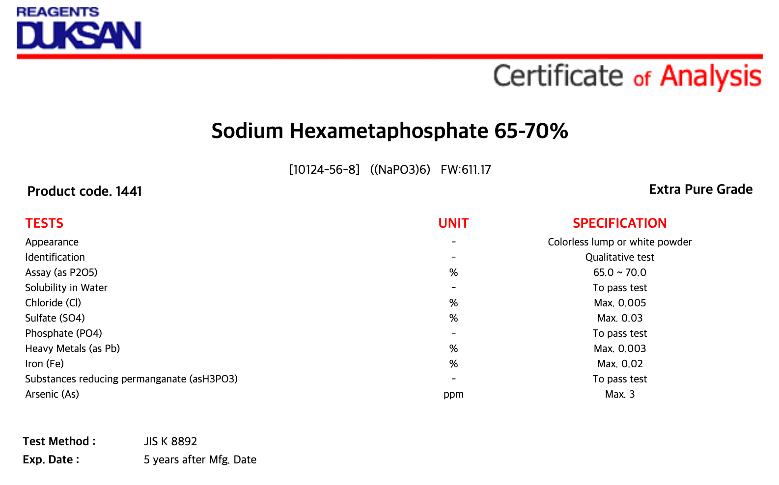 [1441] Sodium Hexametaphosphate, Extra Pure, 1 kg, CAS# 10124-56-8 + 11,400원