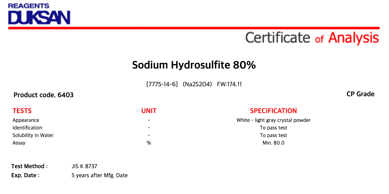 6403 1. Sodium Hydrosulfite, CP, 1 kg, CAS# 7775-14-6 1/EA 소비자가 : 15,800원