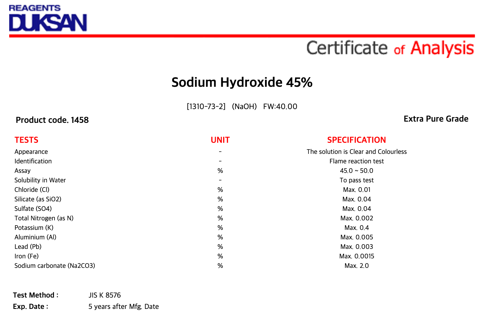 1458 1. Sodium Hydroxide 45%, Extra Pure, 25 kg, CAS# 1310-73-2 1/EA 소비자가 : 56,700원