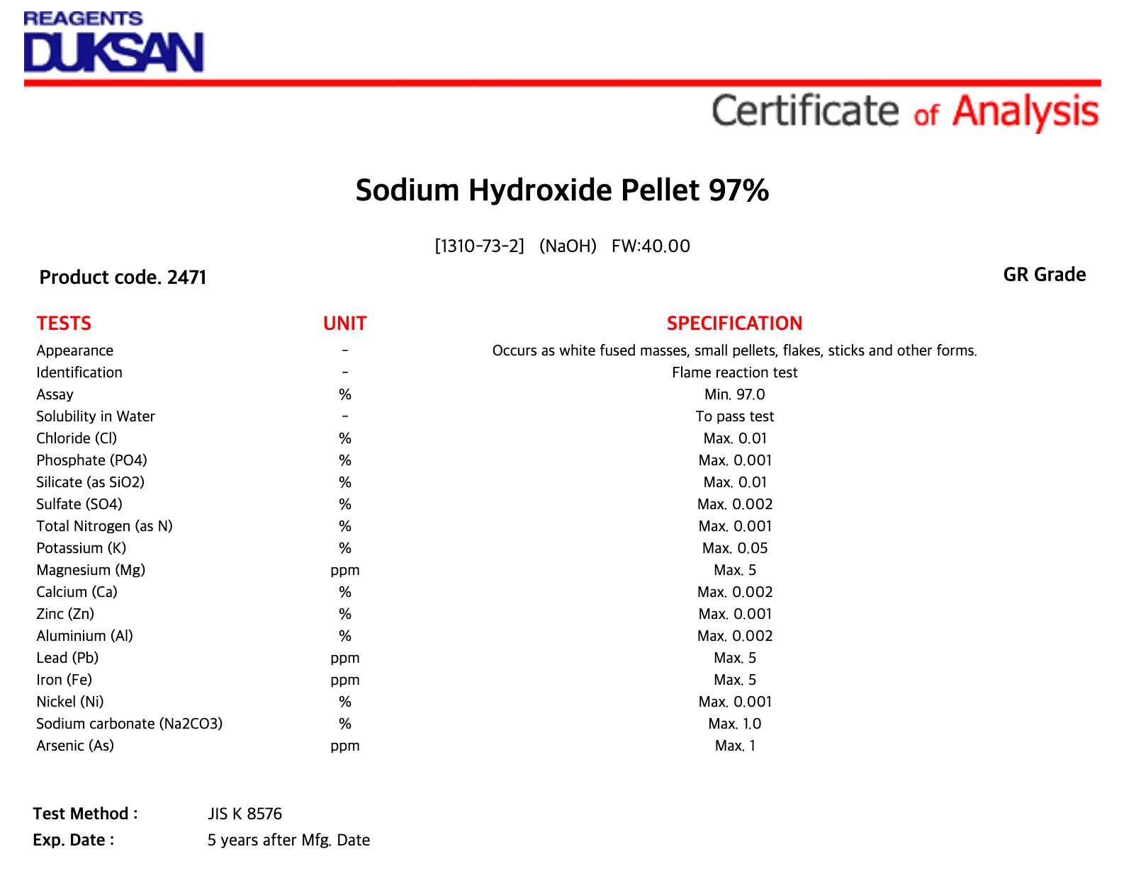 2471 1. Sodium Hydroxide Pellet, GR, 15 kg, CAS# 1310-73-2 1/EA 소비자가 : 412,500원