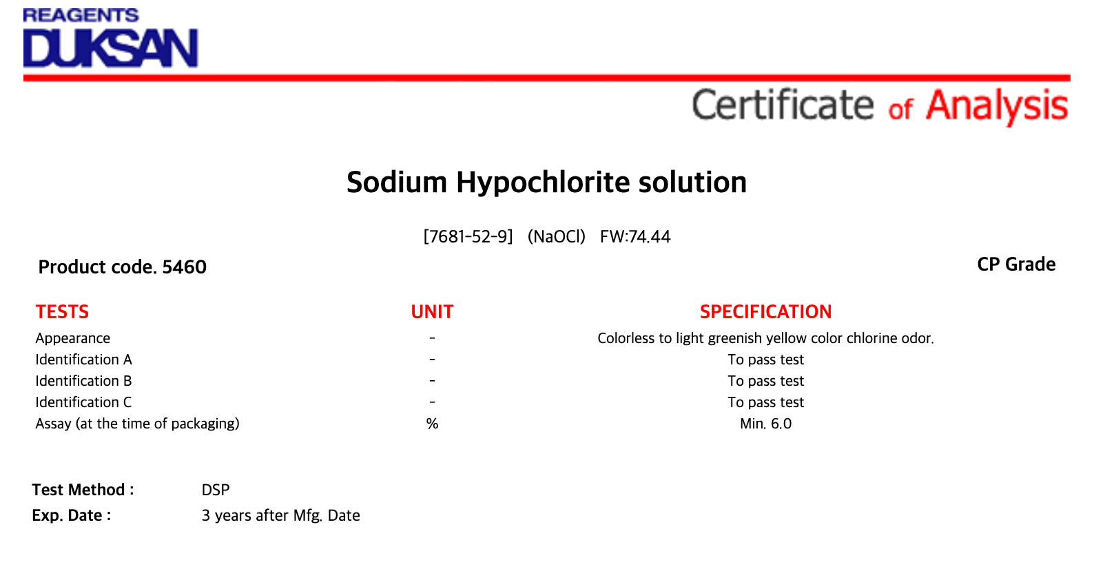 [5460] Sodium Hypochlorite solution, CP, 1 kg, CAS# 7681-52-9 + 6,600원